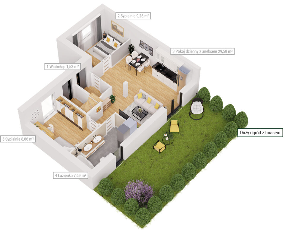 Apartamenty usytuowane na parterze mają własne ogródki, które są idealne do relaksu na świeżym powietrzu i uprawy roślin, natomiast mieszkania na wyższych piętrach pozwalają cieszyć się przestronnymi tarasami, które tworzą intymną przestrzeń do wypoczynku. Takie rozwiązania zapewnią Ci prywatność i wygodę, jednocześnie umożliwiając korzystanie z zalet relaksu pod gołym niebem. Dodatkowo, każdy apartament ma jedno zewnętrzne miejsce parkingowe.