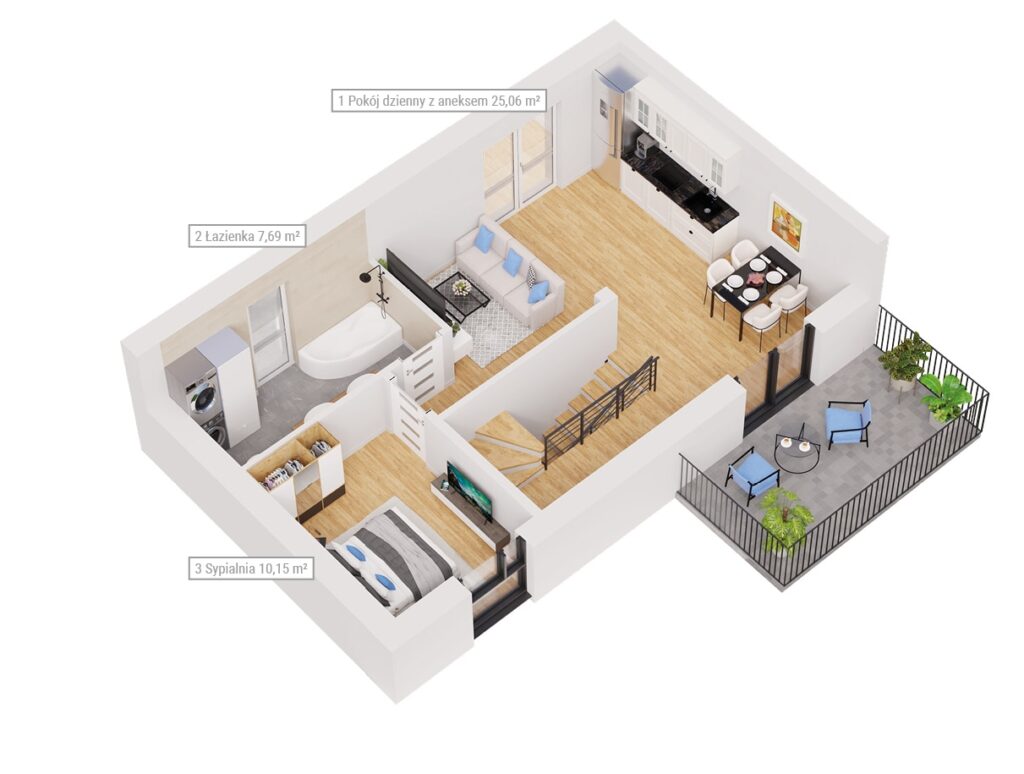 Dolny apartament o powierzchni 57 m² oferuje przestronną strefę dzienną z aneksem kuchennym, 2 duże sypialnie, łazienkę i wiatrołap. Przynależy do niego również wspomniany ogródek. Natomiast górny apartament, o powierzchni 76 m², rozmieszczony jest na dwóch kondygnacjach. Na pierwszej kondygnacji (48 m²) znajduje się strefa dzienna z aneksem kuchennym oraz taras (około 12 m²), mała sypialnia i łazienka. Klatka schodowa prowadzi na użytkowe poddasze (25 m²), gdzie znajdują się dwie dodatkowe sypialnie.